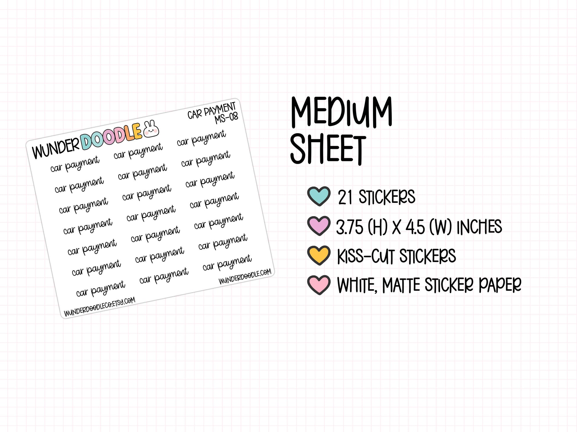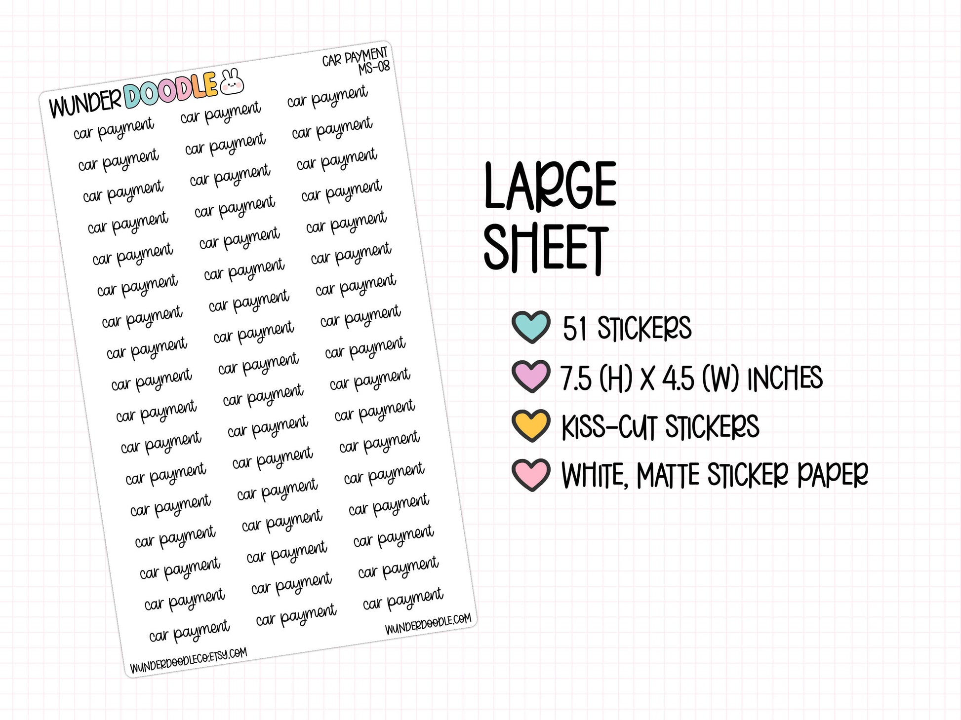 Available in large, medium, and mini sheets, these stickers are printed on crisp, white matte paper for a clean, professional look. They're not repositionable, so once they’re down, they’re staying put—just like that car payment, unfortunately. Whether you're tackling your finances like a pro or just need a little nudge to stay on top of due dates, these stickers have you covered. Grab a sheet (or a few) and make budgeting just a little more fun!