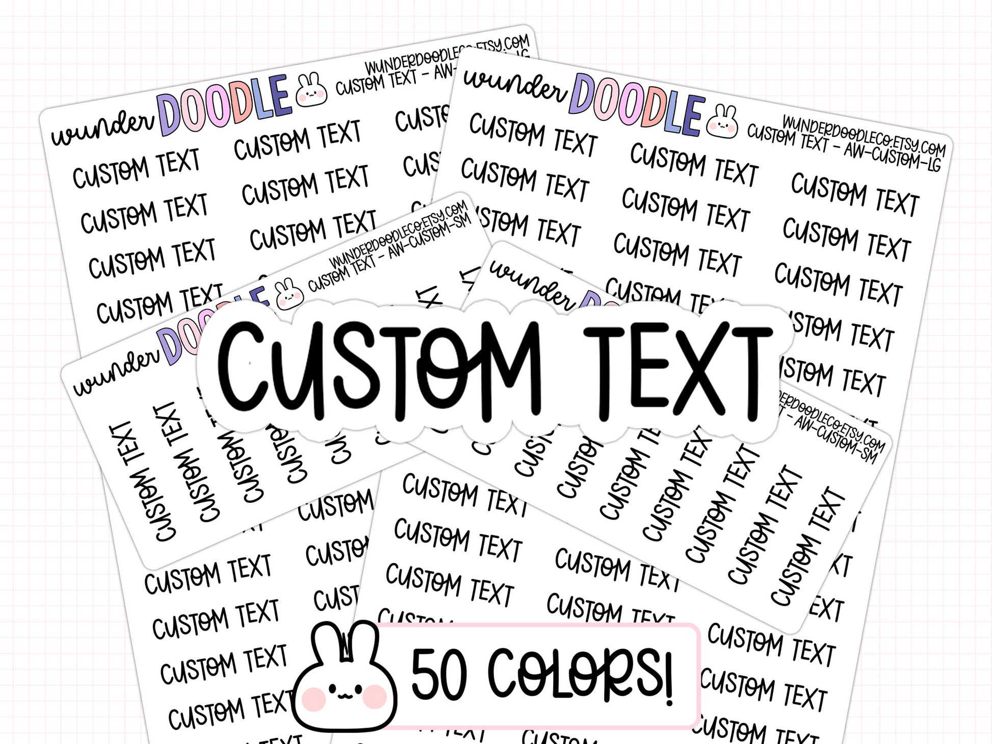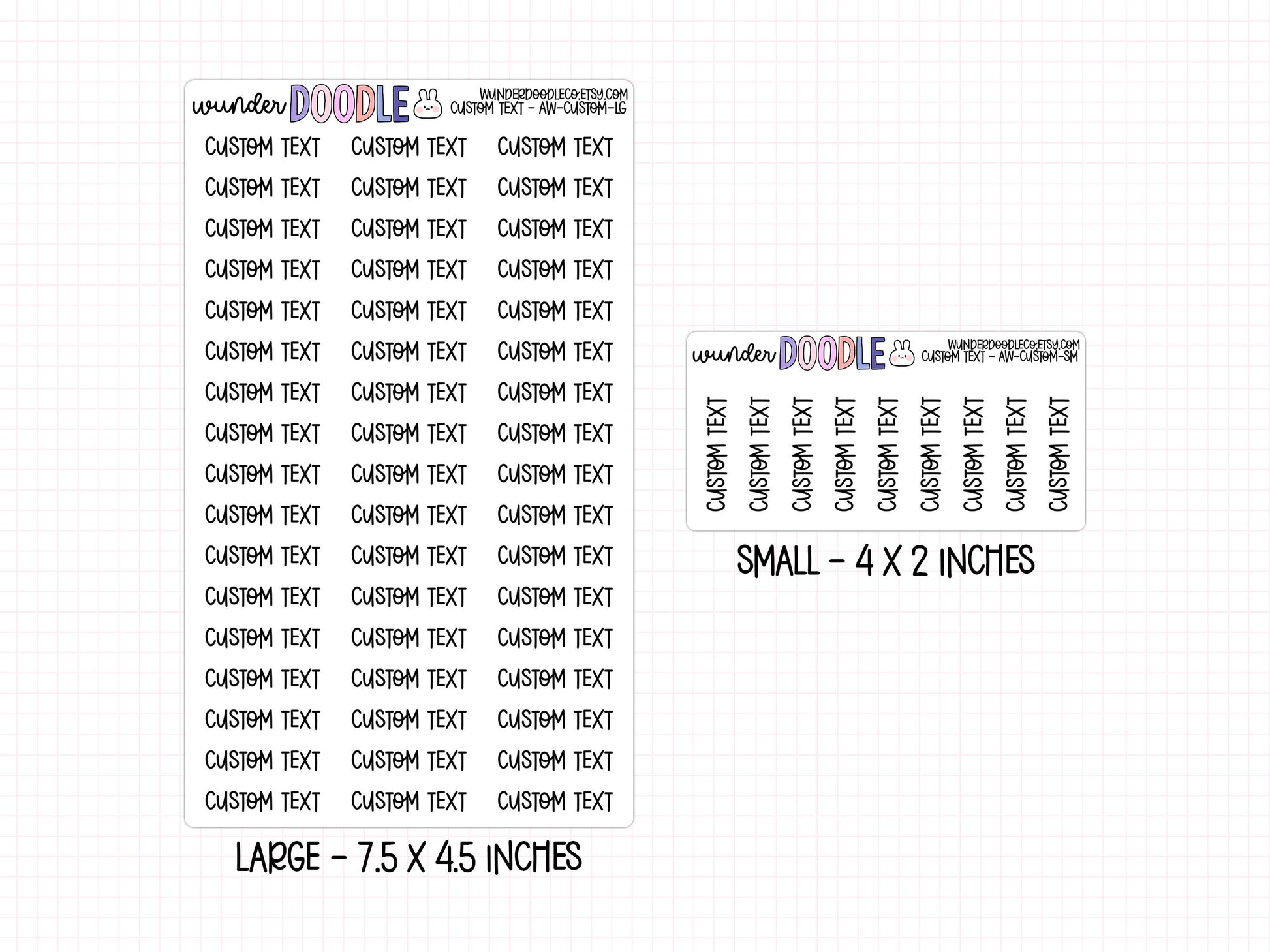 Create customized stickers for your planner with our Custom Text Planner Stickers! Choose from over 50 text colors and add a unique touch to your planning. Each sticker measures less than 1.4 inches wide and 0.3 inches tall, making them perfect for any planner layout. With a limit of one word or phrase per sheet, these sticker sheets come in two sizes. Personalize your planning with a playful touch!