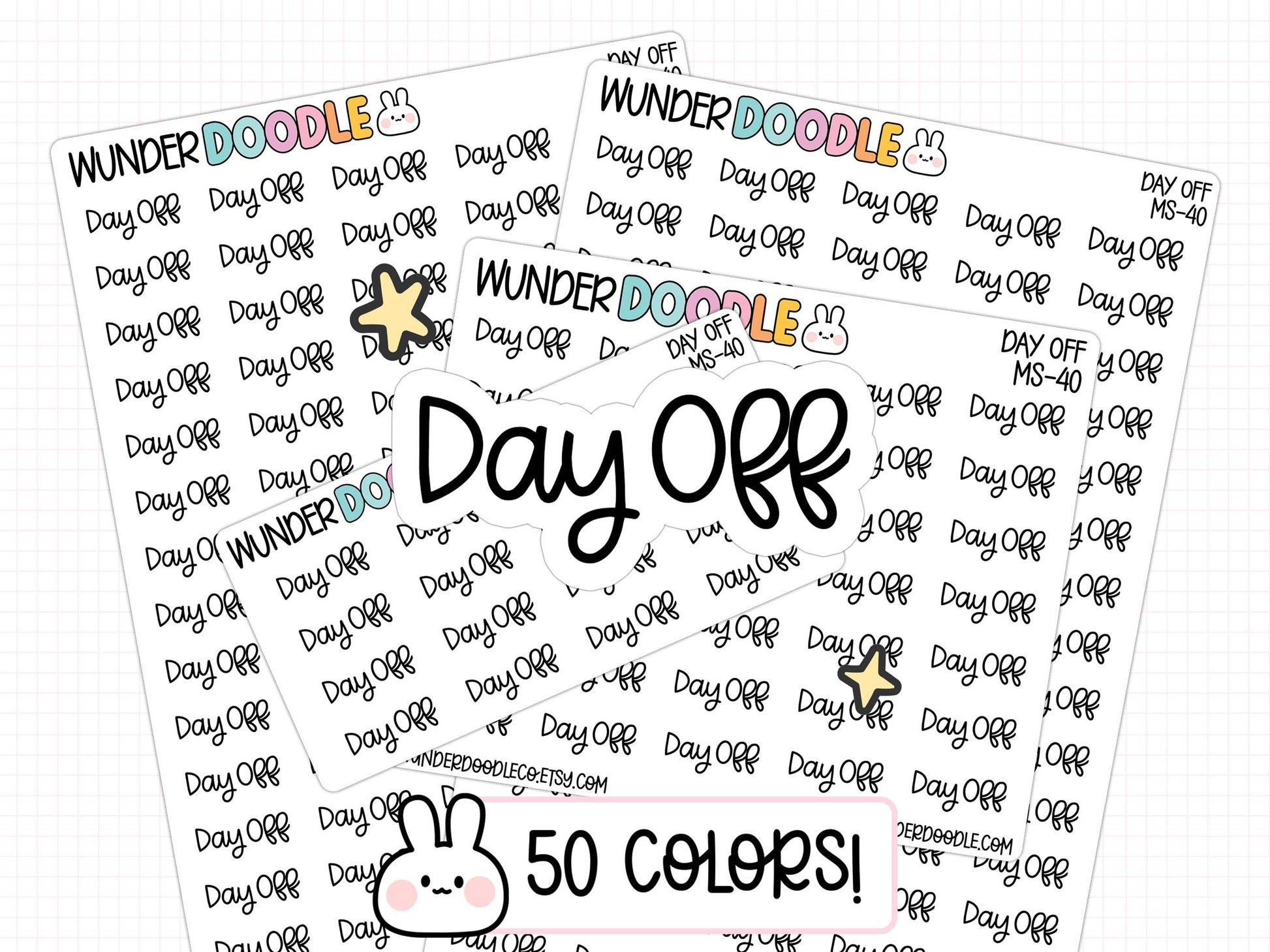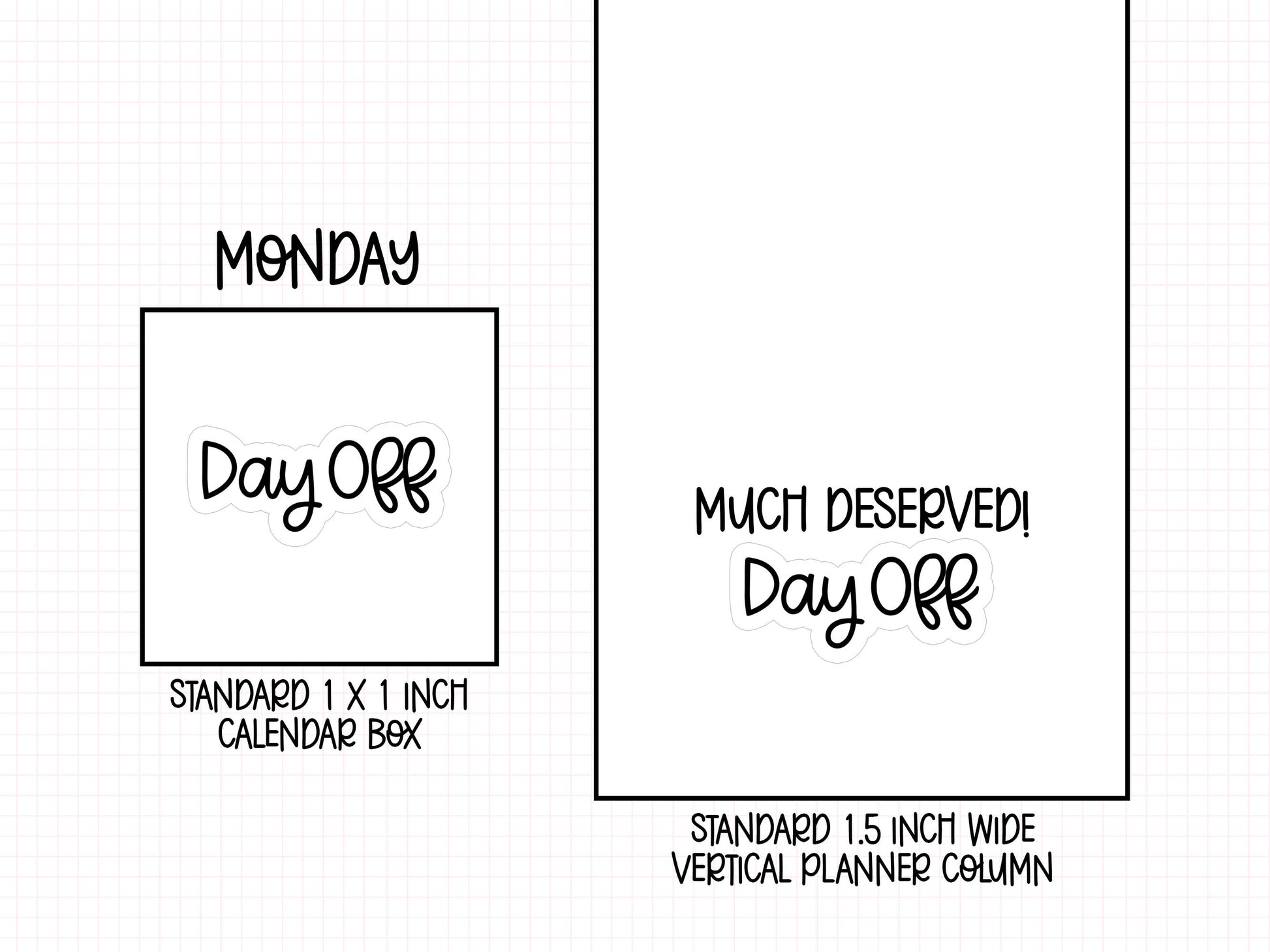 ✨ Day off? More like “heck yes” in sticker form! These functional planner stickers make it official—you're off the clock and ready to relax! Each sticker sheet is packed with crisp, easy-to-read “Day Off” stickers in your choice of 50 dreamy colors (because even your days off deserve options). Measuring a neat 0.75” wide x 0.35” tall, they’re the perfect size to fit in planners, bullet journals, or wherever you track your much-needed breaks. Printed on white matte sticker paper, these little beauties are here to stay—no repositioning, no take-backs!