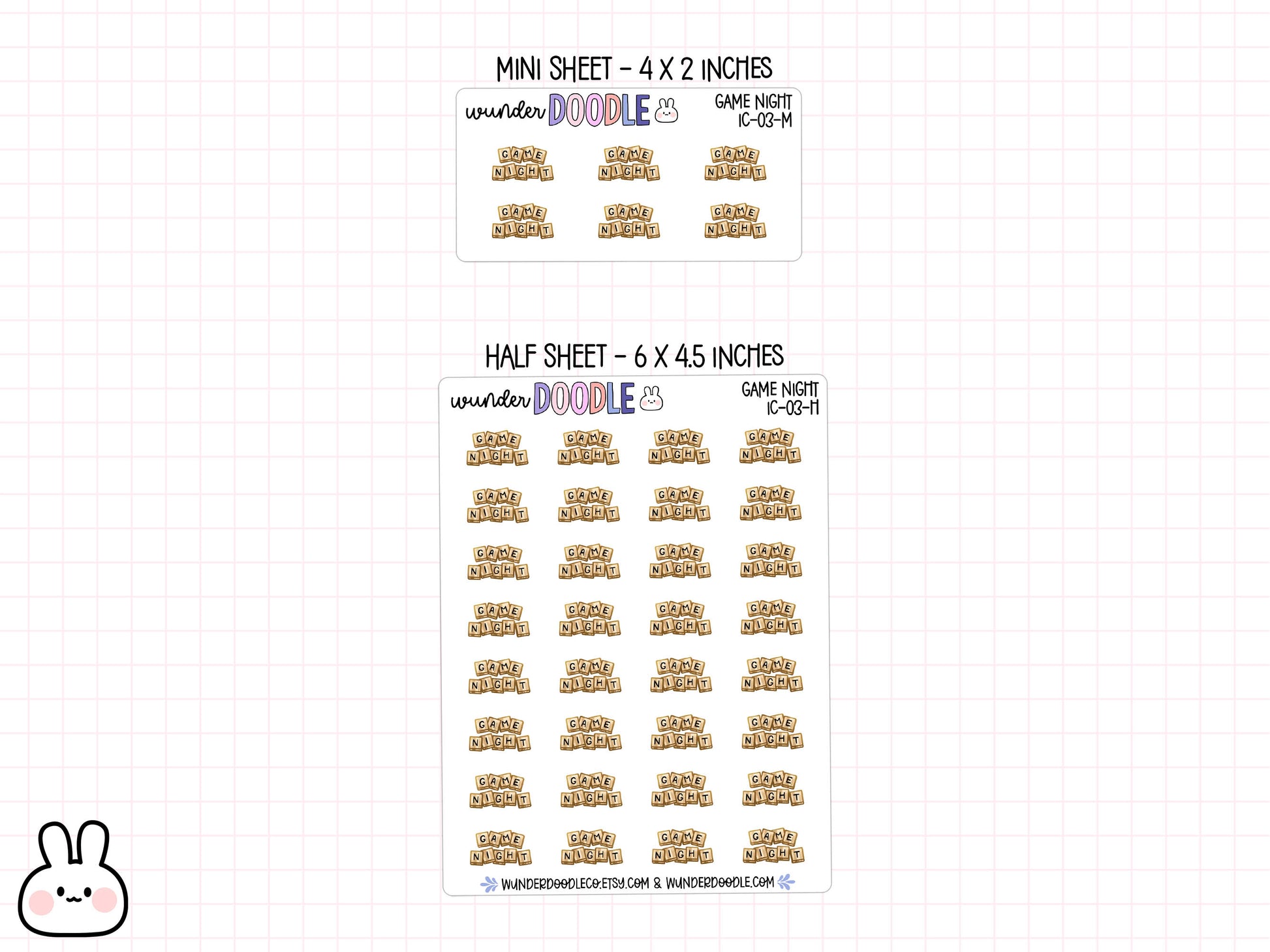 🎉 Hey there, game night guru! Ready to level up your weekly planner? Our Game Night stickers are here to add some serious fun to your pages. These little icons feature Scrabble tiles spelling out "Game Night," perfect for marking those epic board game battles in your weekly planner. Measuring 0.8" wide by 0.5" tall, they’re the perfect size to fit snugly in any planner box. Just a heads-up—they’re not repositionable, so make sure your game night plans are set in stone (or at least in ink 😉). Plus, with two sticker sheet sizes available, you can stock up and never miss a chance to show off your love for all things board games!