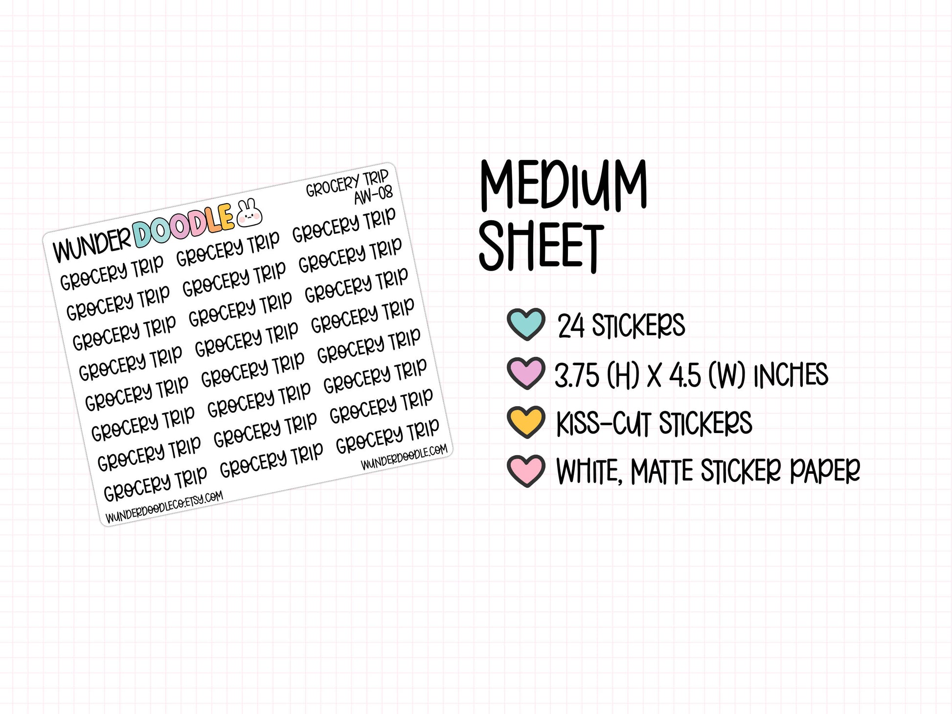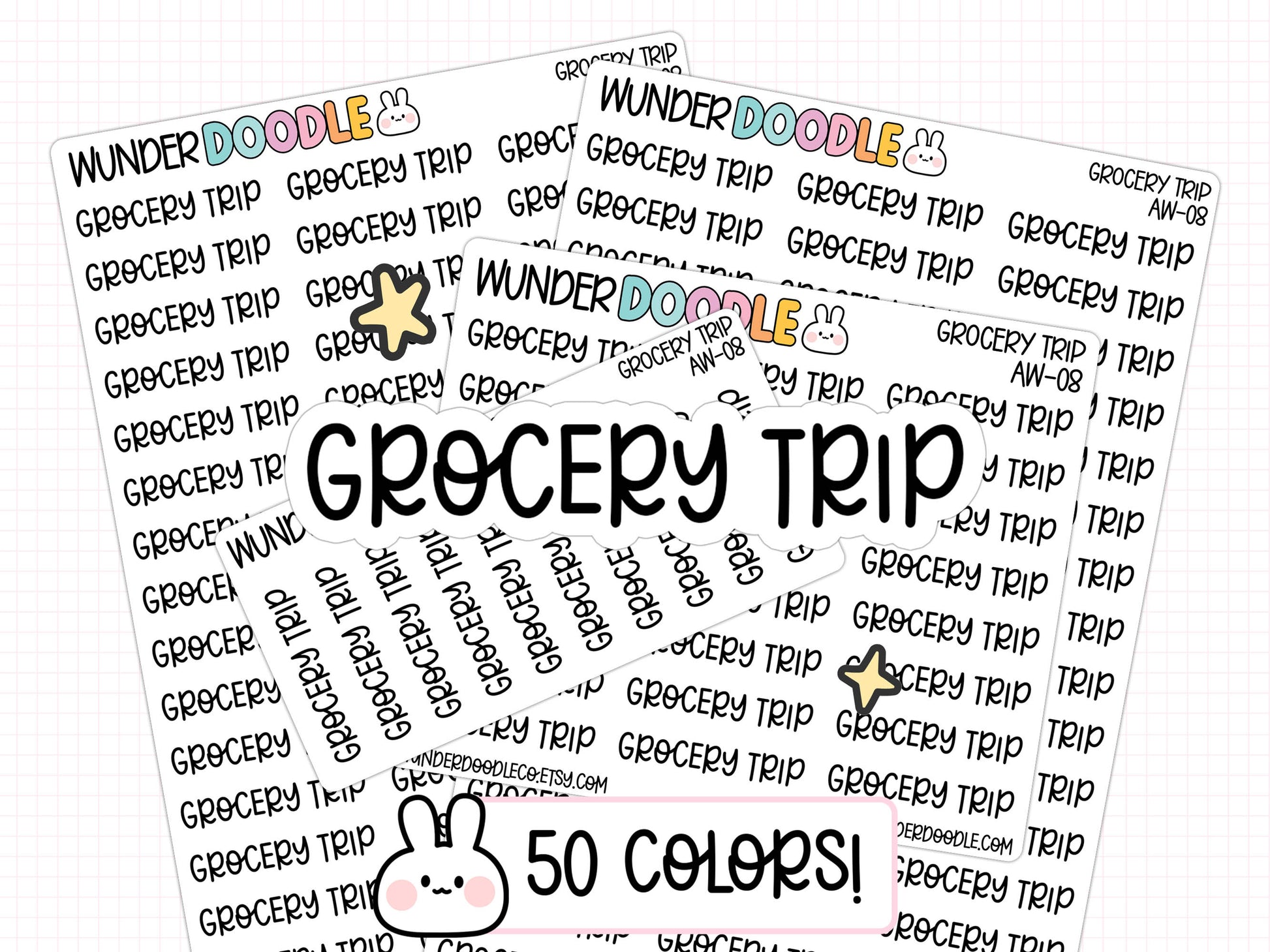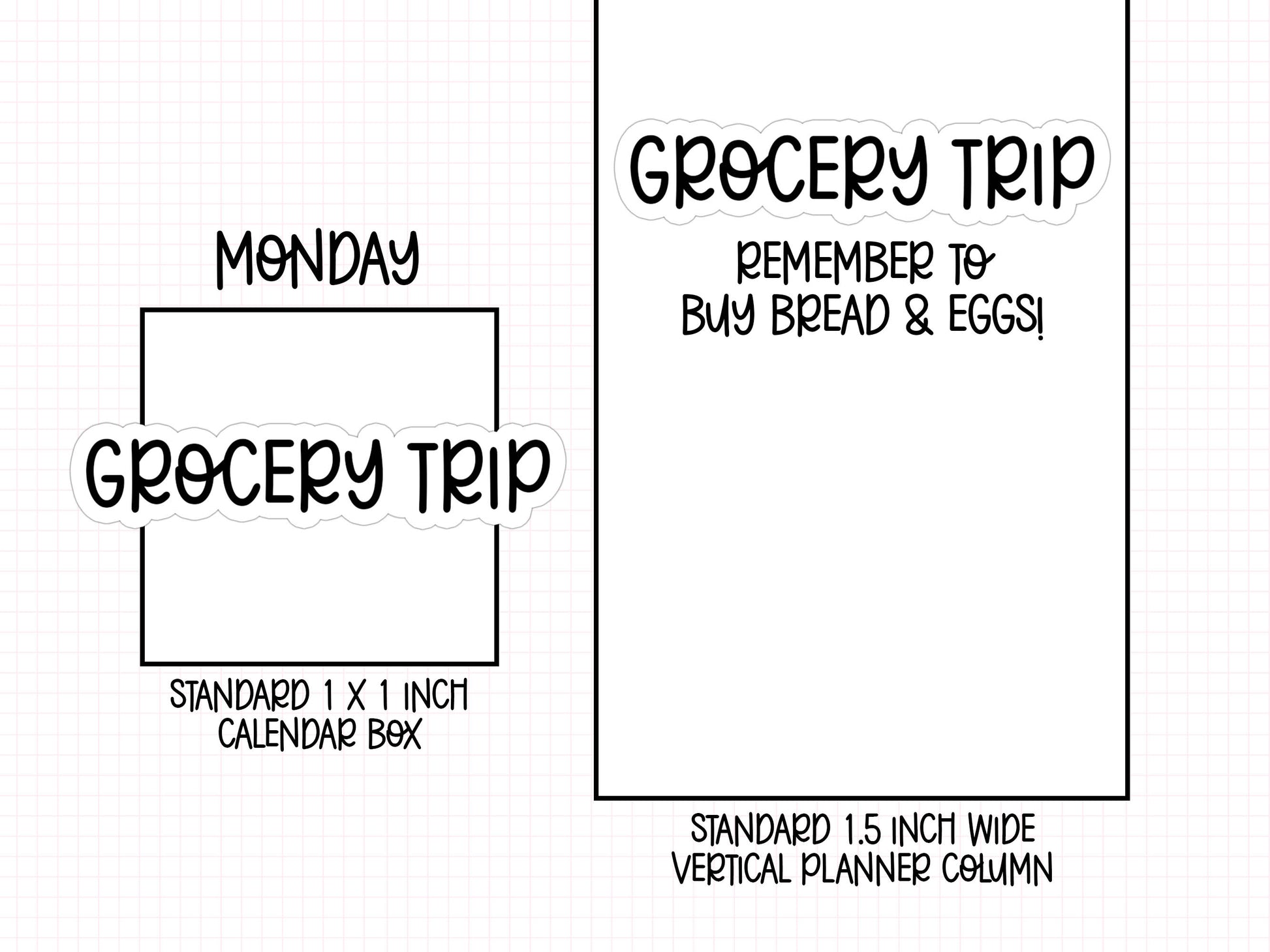 Say goodbye to scattered grocery lists and forgotten essentials. Our Grocery Trip planner stickers keep your shopping plans right on track with a playful, handwritten font that’s easy on the eyes and big on organization. With each individual sticker measuring 1.4 inches wide and 0.3 inches tall, they fit perfectly in any planner layout. Plus, with a choice of 50 colors, you’ll have the flexibility to match each shopping list with your planner’s theme or your current mood.