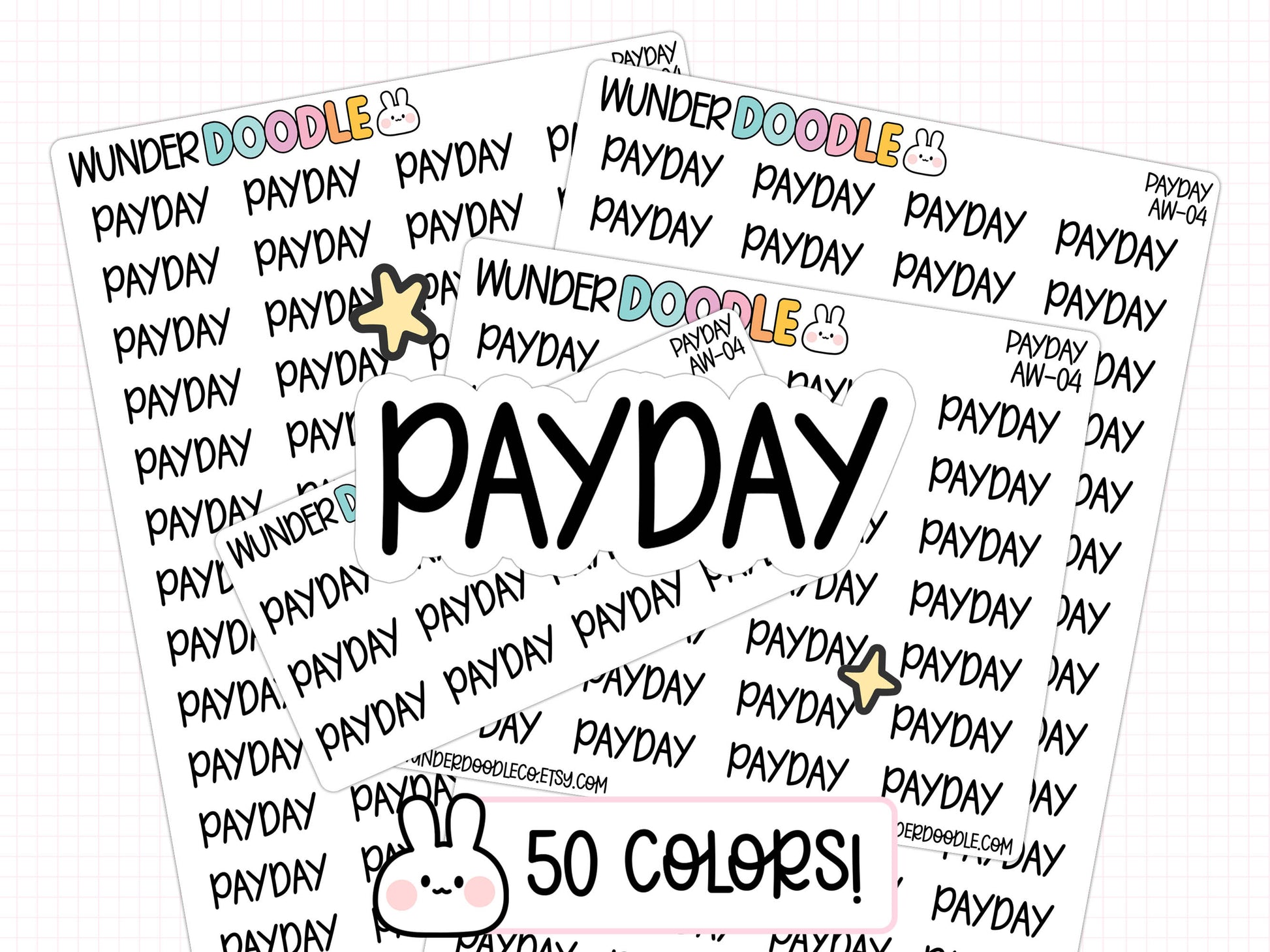 Hey there, budget bosses! Our "Payday" planner stickers are here to make sure you never miss the sweet arrival of payday. Each sticker features the word "payday" in an adorable handwritten font that brings just the right touch of charm to your planner or journal. With 50 colors to choose from, these payday stickers give you all the variety you need to match any theme or color scheme you’ve got going on. Each individual sticker measures 0.92 inches wide by 0.35 inches tall, making them the perfect size to pop into any planner layout without taking up too much space.