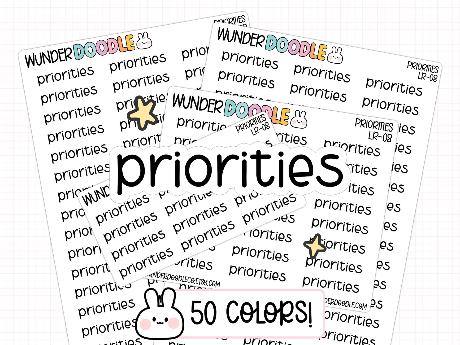Stay on top of your to-do list with these "Priorities" planner stickers—because let's be honest, sometimes we need a little reminder of what actually matters (like finishing that task before getting lost in a deep dive on cute dog videos). Each sticker is printed on crisp, white matte paper, making them easy to write around and perfectly legible at a glance. With 50 colors to choose from, you can match your aesthetic, color-code your chaos, or just pick your favorite shade and stick with it. Available in large, medium, and mini sheet sizes, these stickers fit planners of all shapes and sizes.