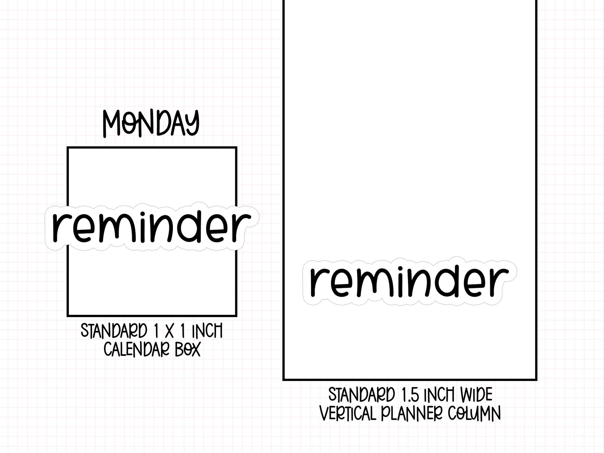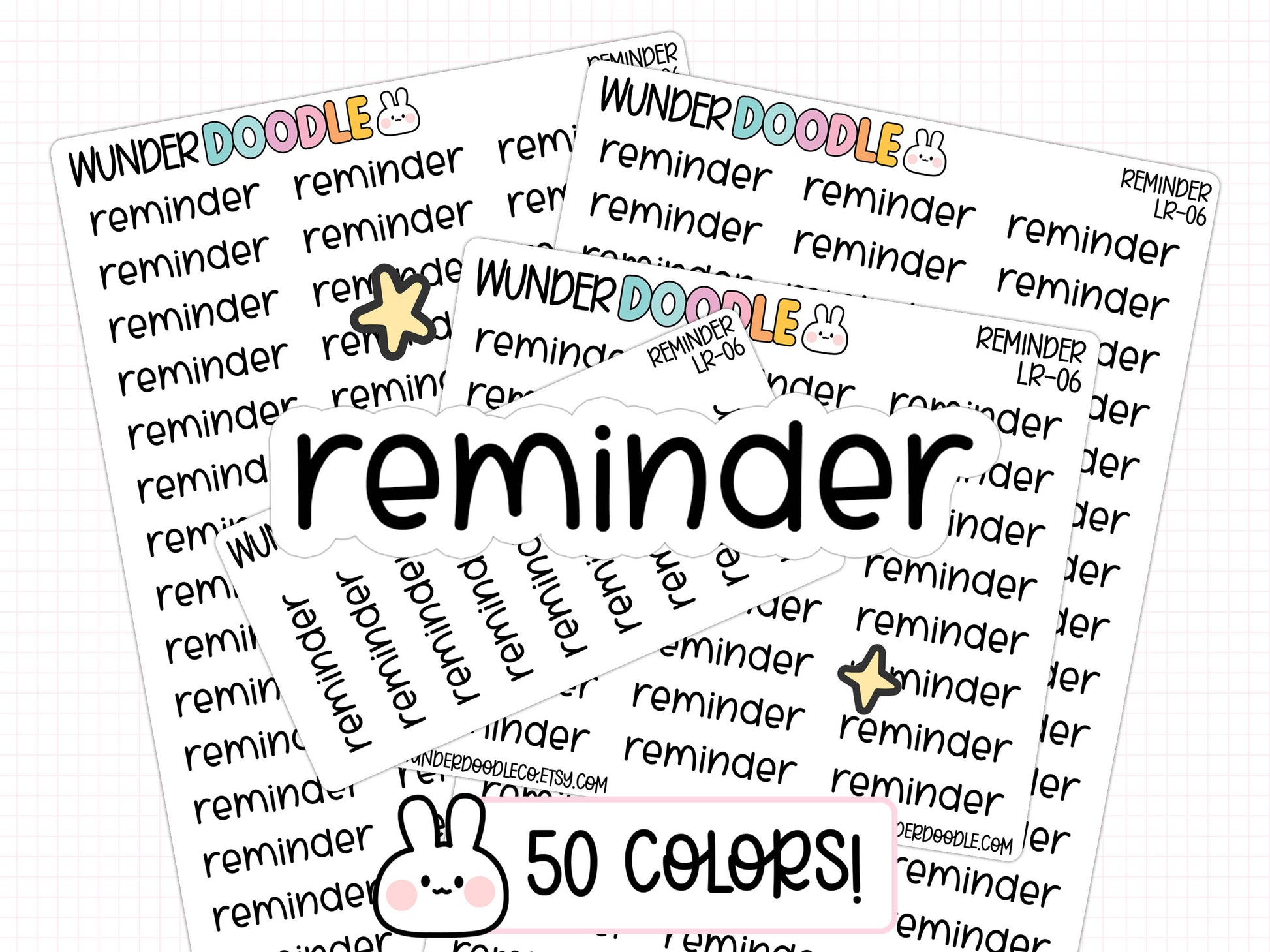 Hey, forgetful friend! Need a little nudge to keep your plans on track? These Reminder planner stickers are here to save the day—because let’s be real, your brain is juggling a million things, and sometimes even "buy milk" slips through the cracks. Each sticker is perfectly sized at 1.3 inches wide and 0.3 inches tall, making them the ideal fit for any planner, bullet journal, or calendar. With 50 gorgeous colors to choose from, you can color-code your chaos or just pick your favorites. Printed on crisp, white matte sticker paper, these stickers are ready to stick and stay—because once they’re down, they’re not going anywhere.