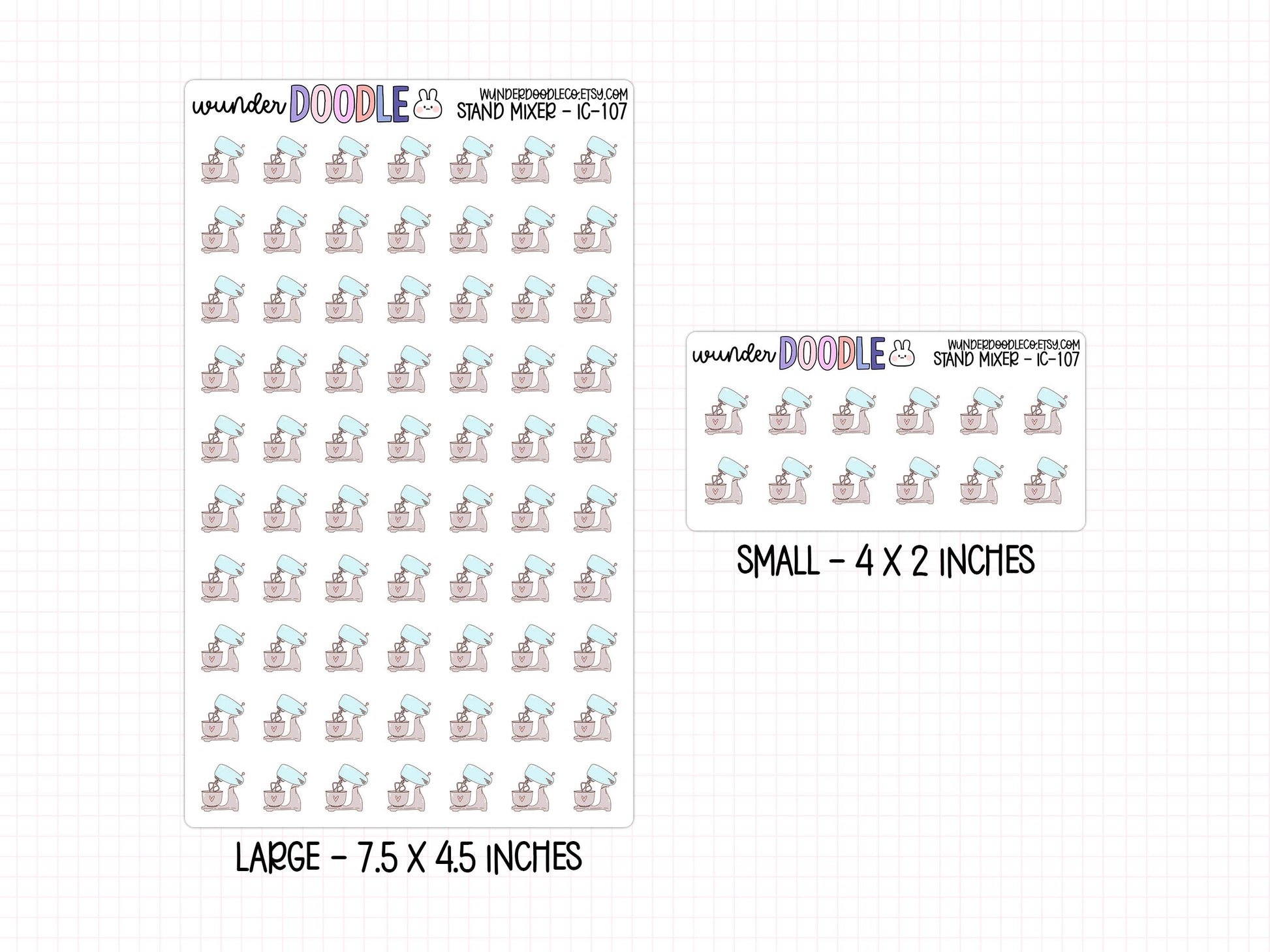Choose from two sheet sizes: a large sheet at 7.5 x 4.5 inches or a small sheet at 4 x 2 inches—ideal for carrying in your planner pocket. Printed on high-quality white matte sticker paper, these non-repositionable stickers are here to stay. So, if you're looking to add some fun kitchen-themed flair to your pages, grab a sheet of these little mixers and mix things up!