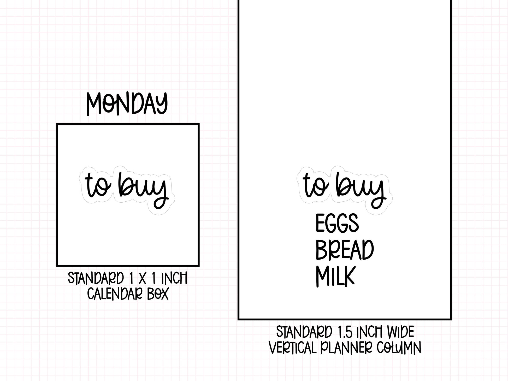 Available in large, medium, and mini sizes, these planner stickers fit perfectly in any layout, whether you're a minimalist planner or a sticker-stacking maximalist. At .68" wide x .35" tall, they’re small but mighty—just like your shopping ambitions. Ready to upgrade your planning game? Snag a "To Buy" sticker sheet now and make your lists look as good as they work! 🛍️✨