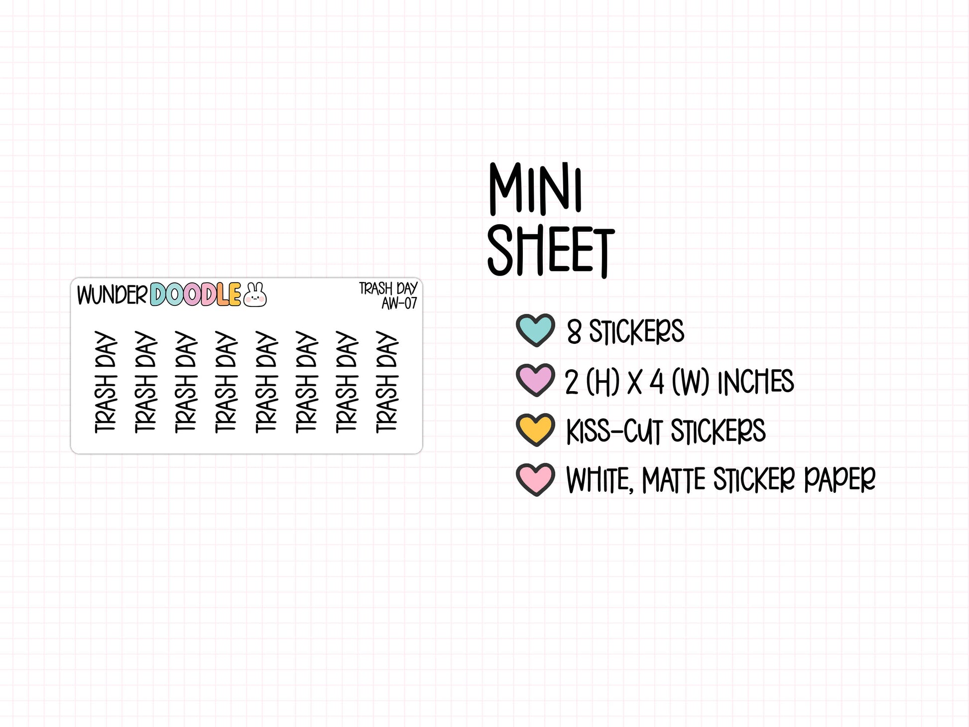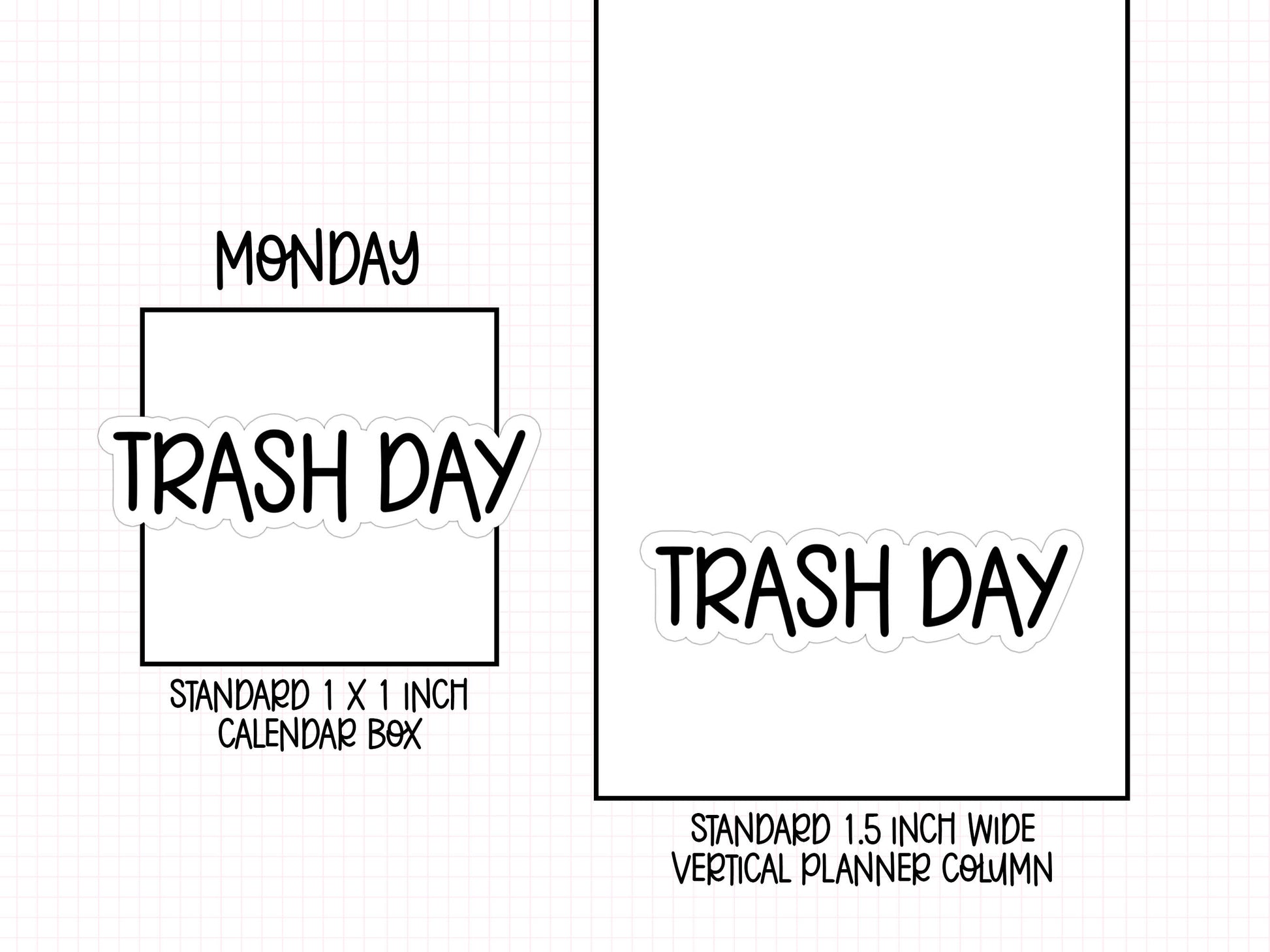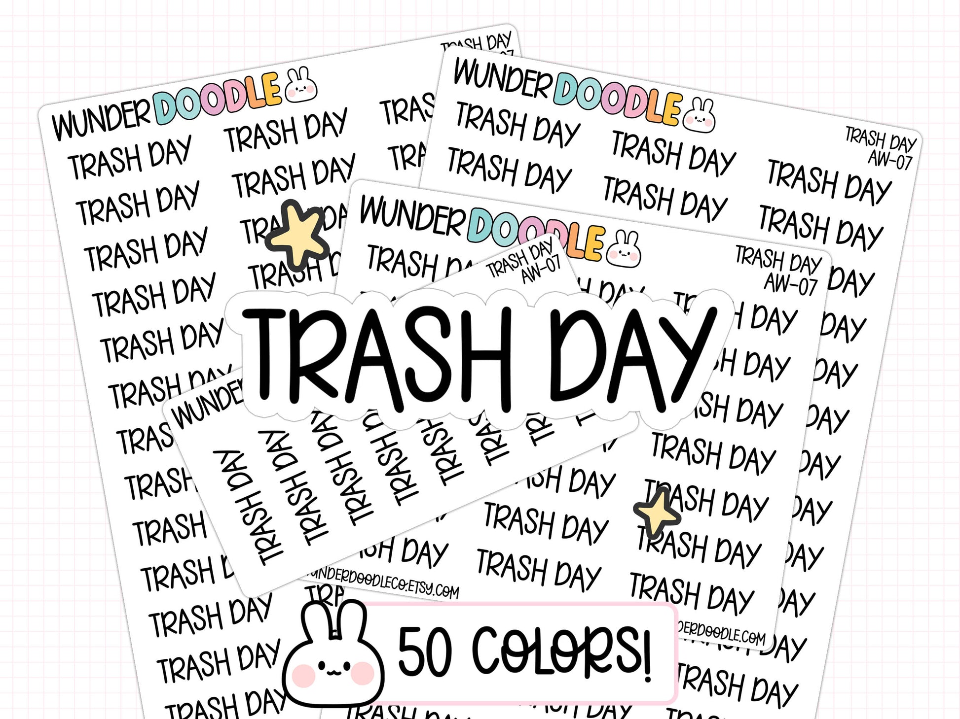 Say goodbye to forgotten trash days with these charming "Trash Day" planner stickers! Featuring the phrase "trash day" in a cute, handwritten font, these stickers make keeping track of trash day easy and fun. Each sticker measures a convenient 1.25 inches wide by 0.35 inches tall and is printed on white matte sticker paper that’s smooth to the touch. With 50 different colors to choose from, there’s a shade for every theme or mood. Whether you’re marking it in your monthly layout or daily spread, these stickers add a pop of personality to your planner!