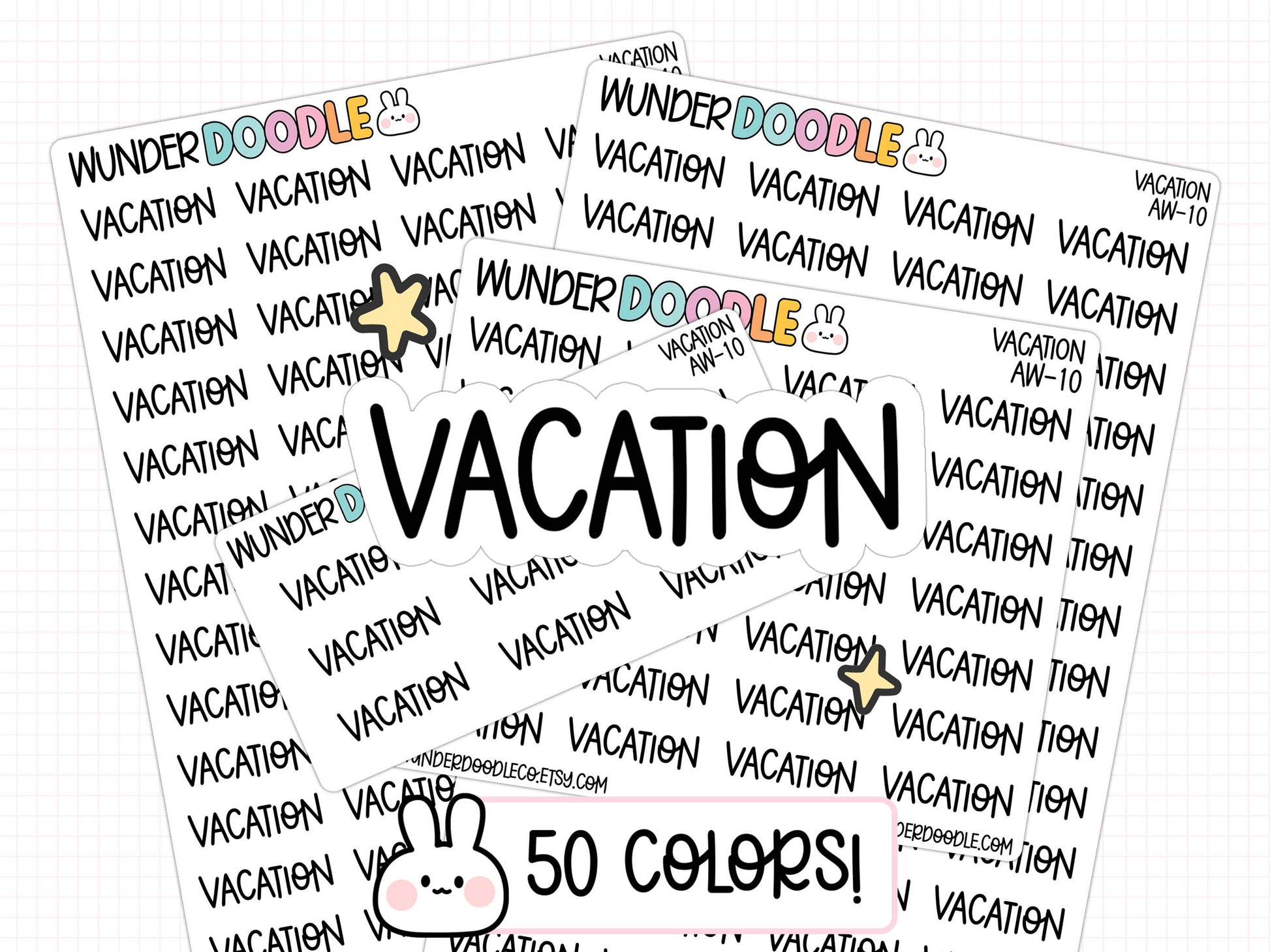 Ready to make your vacation planning as fun as the trip itself? These vacation planner stickers are here to add some flair to your travel schedule. The word "vacation" is written in a cute, handwritten font that’s as dreamy as a beach sunset. Choose from 50 vibrant colors to match your mood, and with each individual sticker measuring 1.02 inches wide by 0.35 inches tall, they fit perfectly on any planner page.
