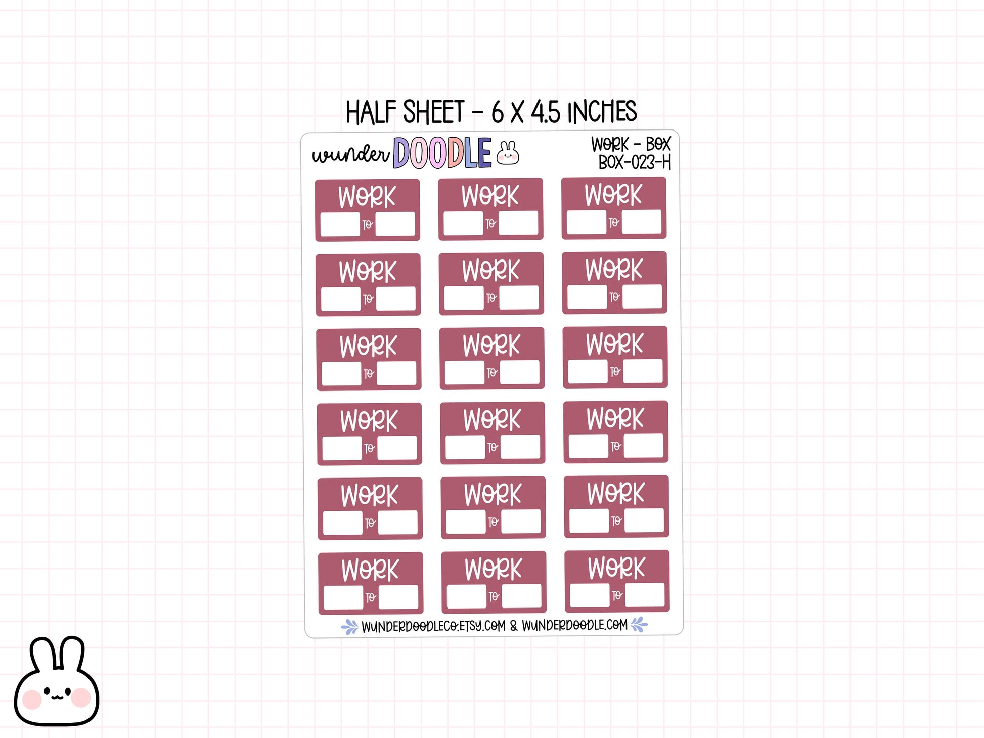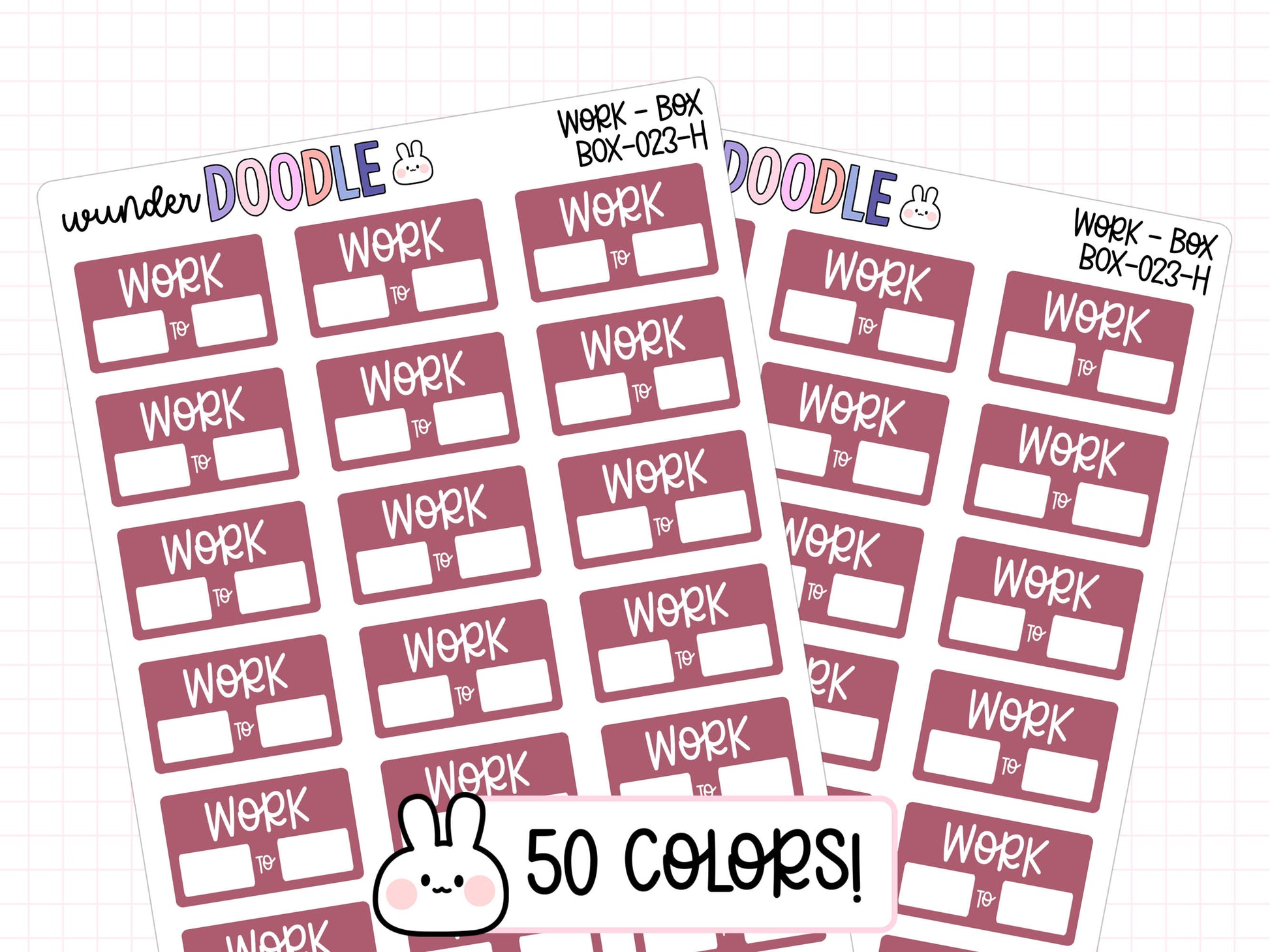 Hey there, productivity wizard! Need a fun and functional way to track your work shifts? These "Work" planner stickers are just the thing. Each sticker features a cute little box with the word "Work" and a blank space for you to jot down your start and end times. With 50 vibrant colors to choose from, you can color-code your week like a pro. Measuring 1.25 x 0.74 inches, they’re perfectly sized to fit your planner without taking over your whole day.